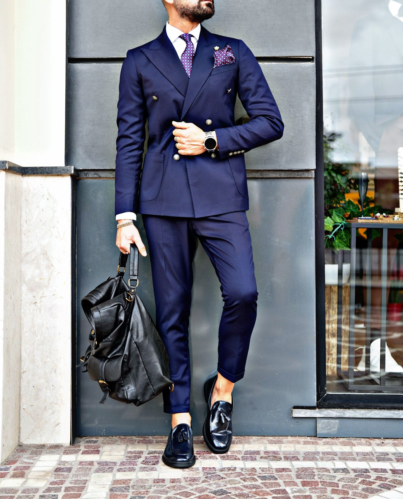 Abito Doppio Petto con bottone Metallo, tasche a toppa interamente foderato. Pantaloni capri con piega inglese.